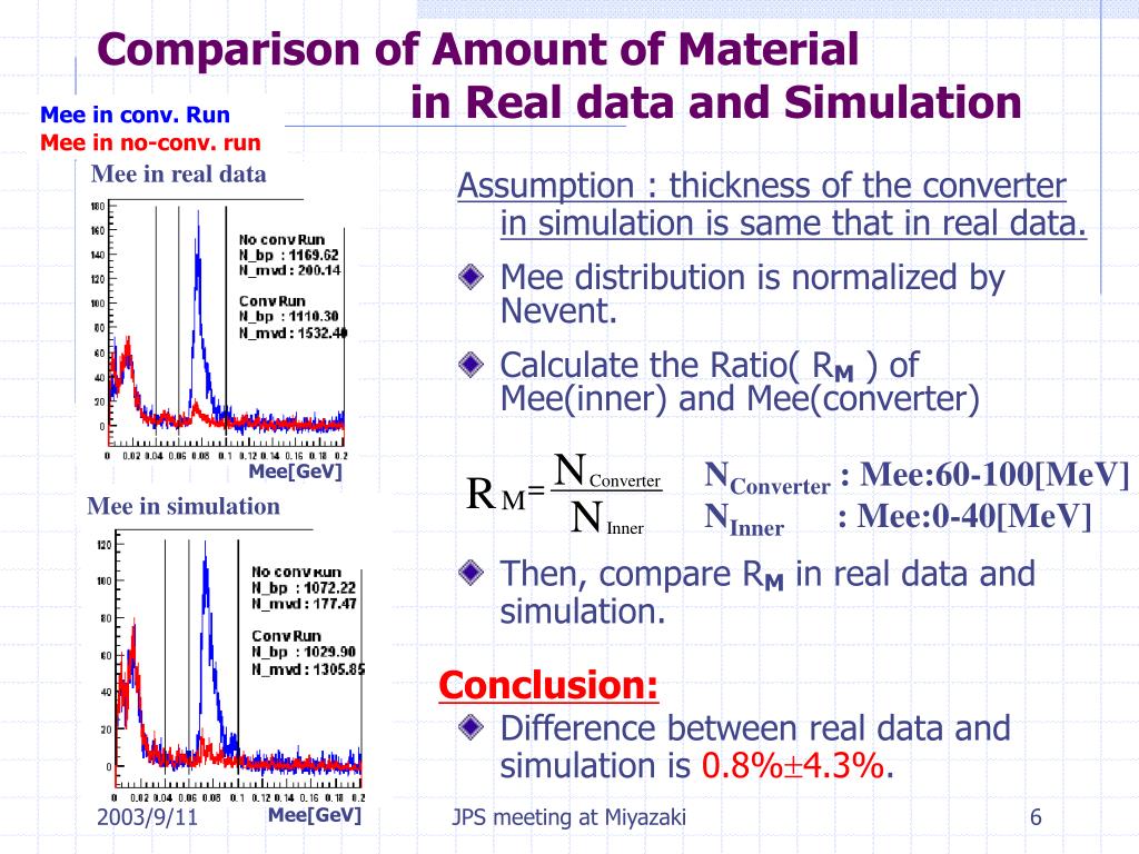 Mee in conv. Run Mee in no-conv. run Mee in real data Mee[GeV] NConverter : Mee:60-100[MeV] NInner : Mee:0-40[MeV] Mee in simulation Mee[GeV] Comparison of Amount of Material in Real data and Simulation Assumption : thickness of the converter in simulation is same that in real data. • Mee distribution is normalized by Nevent. • Calculate the Ratio( RM ) of Mee(inner) and Mee(converter) • Then, compare RM in real data and simulation. • Difference between real data and simulation is 0.8%4.3%. Conclusion: JPS meeting at Miyazaki