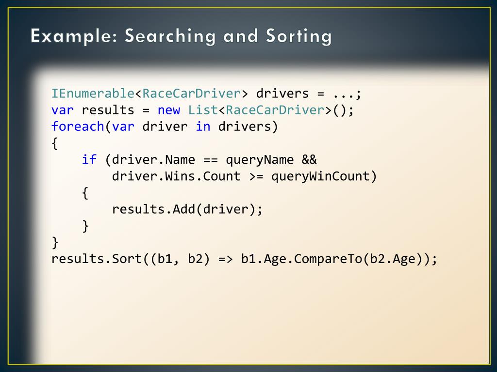 Example: Searching and Sorting IEnumerable<RaceCarDriver> drivers = ...; varresults = new List<RaceCarDriver>(); foreach(var driver in drivers) { if (driver.Name == queryName && driver.Wins.Count >= queryWinCount) { results.Add(driver); } } results.Sort((b1, b2) => b1.Age.CompareTo(b2.Age));