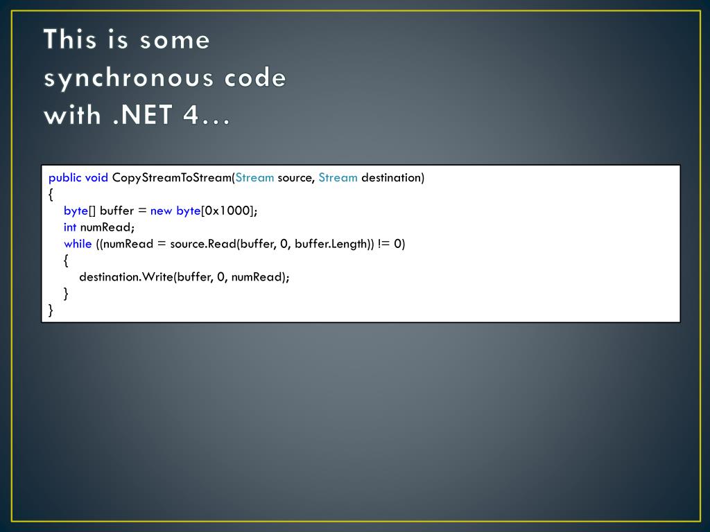 publicIAsyncResultBeginCopyStreamToStream( Stream source, Stream destination){vartcs = newTaskCompletionSource<object>();byte[] buffer = newbyte[0x1000]; Action<IAsyncResult> readWriteLoop = null;readWriteLoop = iar => {try {for (boolisRead = iar == null; ; isRead = !isRead) {switch (isRead) {casetrue:iar = source.BeginRead(buffer, 0, buffer.Length, readResult => {if (readResult.CompletedSynchronously) return;readWriteLoop(readResult); }, null);if (!iar.CompletedSynchronously) return;break;casefalse:intnumRead = source.EndRead(iar);if (numRead == 0) {tcs.TrySetResult(null);return; }iar = destination.BeginWrite(buffer, 0, numRead, writeResult => {if (writeResult.CompletedSynchronously) return;destination.EndWrite(writeResult);readWriteLoop(null); }, null);if (!iar.CompletedSynchronously) return;destination.EndWrite(iar);break; } } }catch (Exception e) { tcs.TrySetException(e); } };readWriteLoop(null); returntcs.Task;} publicvoidEndCopyStreamToStream(IAsyncResultasyncResult){ ((Task)asyncResult).Wait();} This is an expert’s asynchronous code with .NET 4… public voidCopyStreamToStream(Stream source, Stream destination){byte[] buffer = newbyte[0x1000];intnumRead;while ((numRead= source.Read(buffer, 0, buffer.Length)) != 0) {destination.Write(buffer, 0, numRead);}}