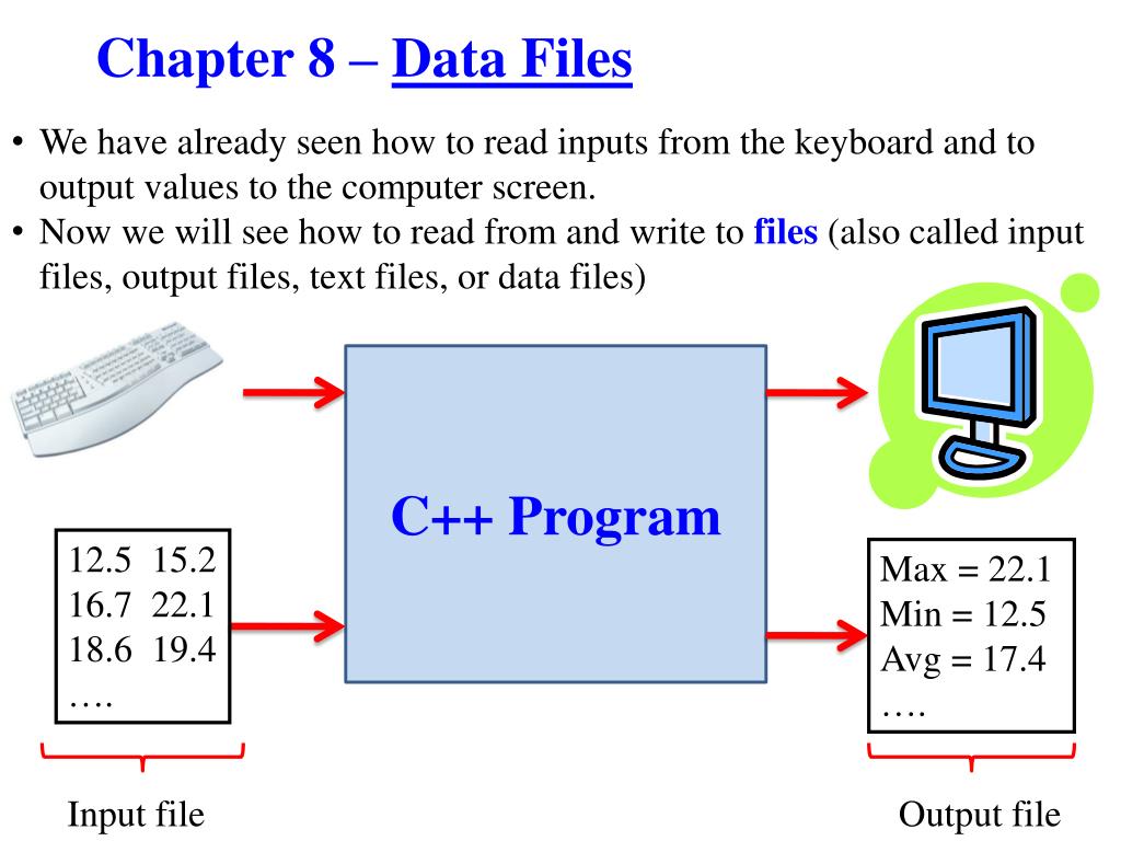 We have already seen how to read inputs from the keyboard and to output values to the computer screen. Now we will see how to read from and write to files (also called input files, output files, text files, or data files). Chapter 8 – Data Files. C++ Program. 12.5 15.2 16.7 22.1