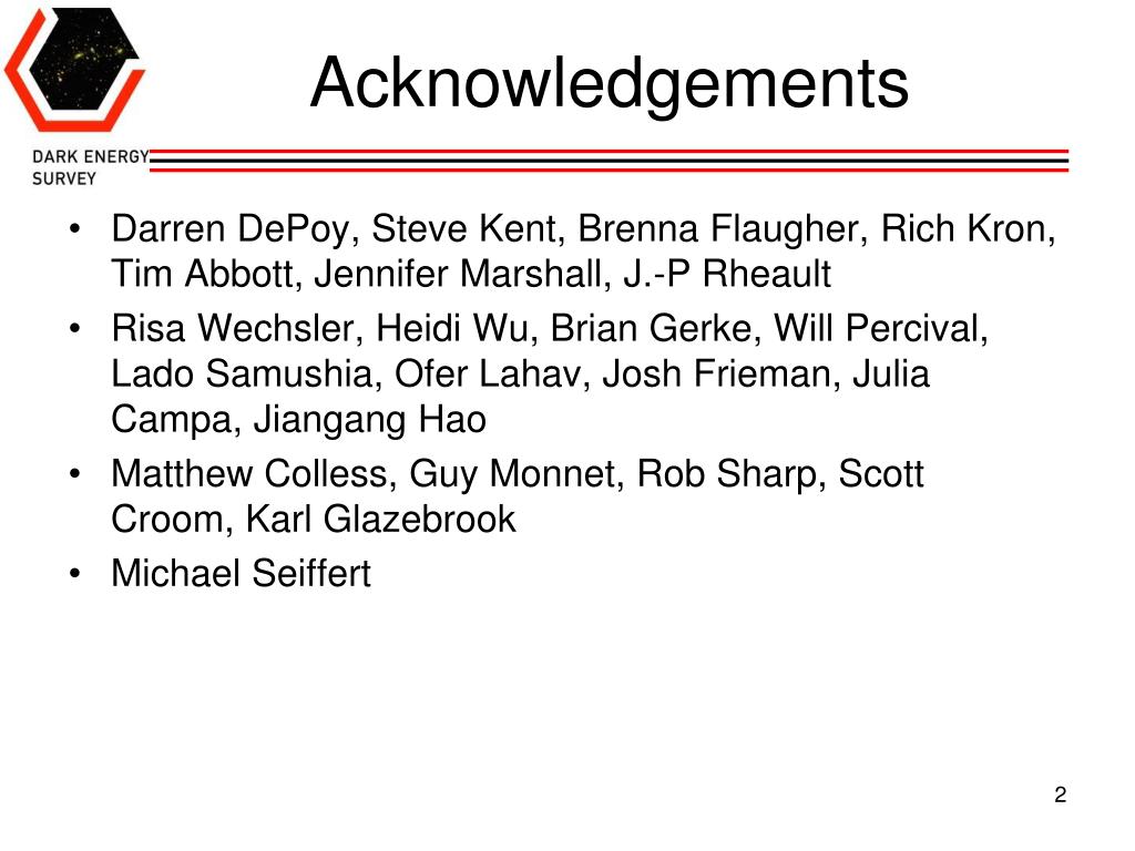 Acknowledgements • Darren DePoy, Steve Kent, Brenna Flaugher, Rich Kron, Tim Abbott, Jennifer Marshall, J.-P Rheault • Risa Wechsler, Heidi Wu, Brian Gerke, Will Percival, Lado Samushia, Ofer Lahav, Josh Frieman, Julia Campa, Jiangang Hao • Matthew Colless, Guy Monnet, Rob Sharp, Scott Croom, Karl Glazebrook • Michael Seiffert