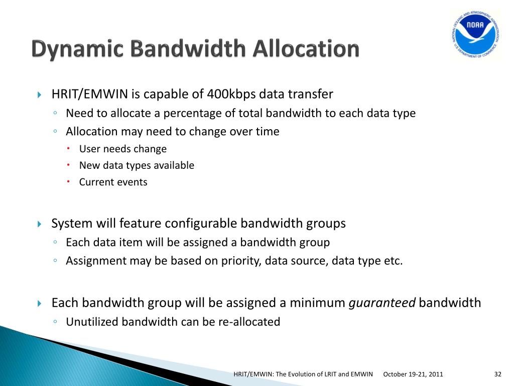 Dynamic Bandwidth Allocation • HRIT/EMWIN is capable of 400kbps data transfer • Need to allocate a percentage of total bandwidth to each data type • Allocation may need to change over time • User needs change • New data types available • Current events • System will feature configurable bandwidth groups • Each data item will be assigned a bandwidth group • Assignment may be based on priority, data source, data type etc. • Each bandwidth group will be assigned a minimum guaranteed bandwidth • Unutilized bandwidth can be re-allocated HRIT/EMWIN: The Evolution of LRIT and EMWIN