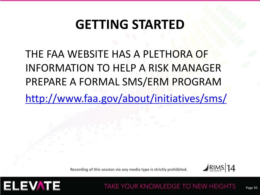 GETTING STARTED • THE FAA WEBSITE HAS A PLETHORA OF INFORMATION TO HELP A RISK MANAGER PREPARE A FORMAL SMS/ERM PROGRAM • http://www.faa.gov/about/initiatives/sms/