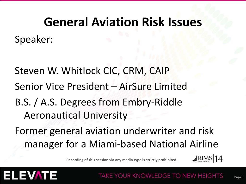 IND001: Industry – Aviation Industry Session. April 28, 2014 2:00PM – 4:00PM. General Aviation Risk Issues. April 28, 2014. General Aviation Risk Issues Speaker: Steven W. Whitlock CIC, CRM, CAIP Senior Vice President – AirSure Limited