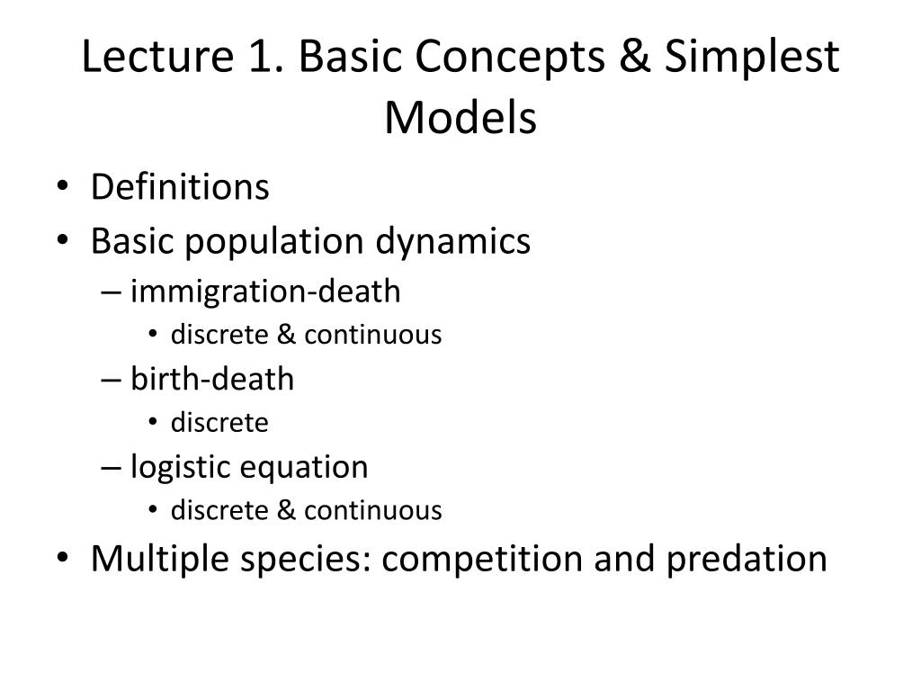 Lecture 1. Basic Concepts & Simplest Models • Definitions • Basic population dynamics • immigration-death • discrete & continuous • birth-death • discrete • logistic equation • discrete & continuous • Multiple species: competition and predation