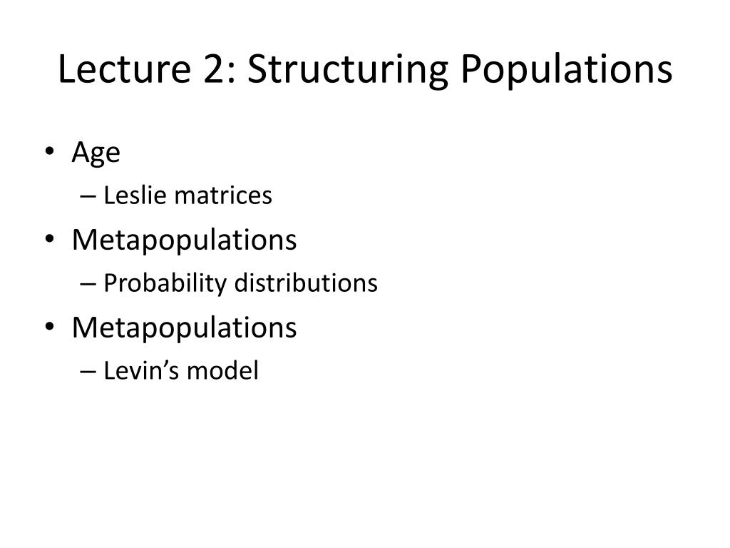 Lecture 2: Structuring Populations • Age • Leslie matrices • Metapopulations • Probability distributions • Metapopulations • Levin’s model