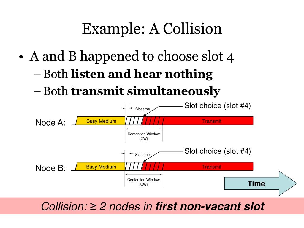 Slot choice (slot #4) Slot choice (slot #4) Example: A Collision • A and B happened to choose slot 4 • Both listen and hear nothing • Both transmit simultaneously Node A: Node B: Time Collision: ≥ 2 nodes in first non-vacant slot