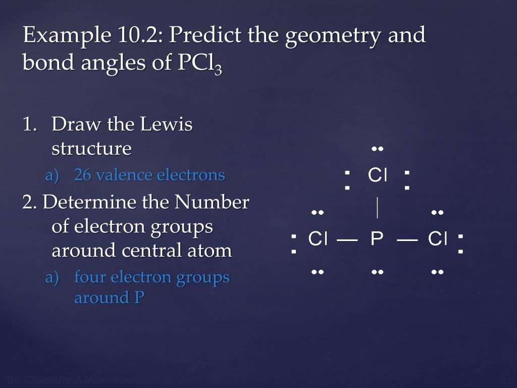 Example 10.2: Predict the geometry and bond angles of PCl3 1. Draw the Lewis structure a) 26 valence electrons 2. Determine the Number of electron groups around central atom a) four electron groups around P Tro: Chemistry: A Molecular Approach, 2/e