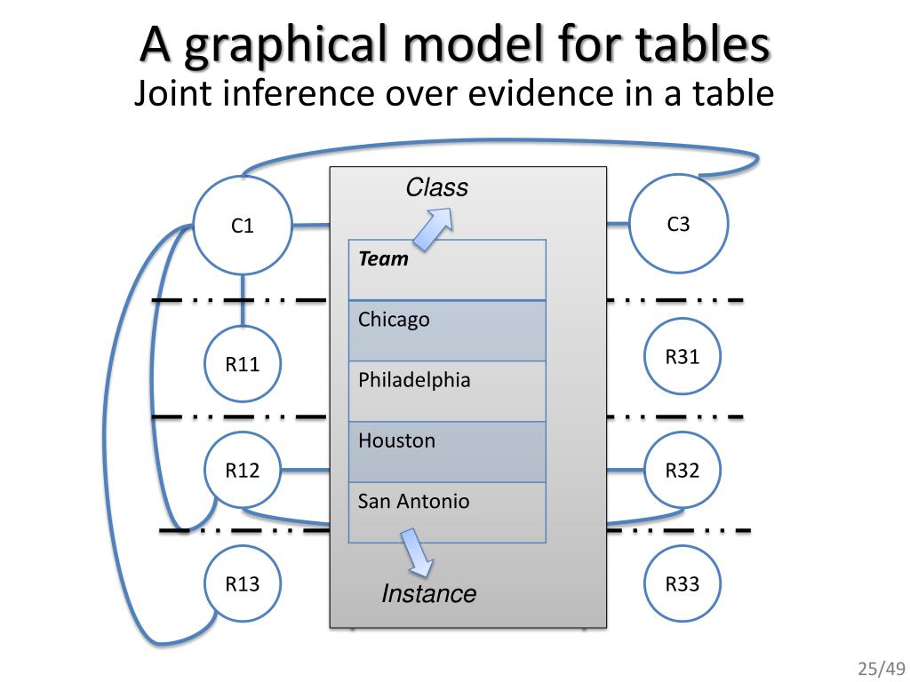 A graphical model for tablesJoint inference over evidence in a table Class C2 C3 C1 R21 R31 R11 R12 R22 R32 R13 R23 R33 Instance