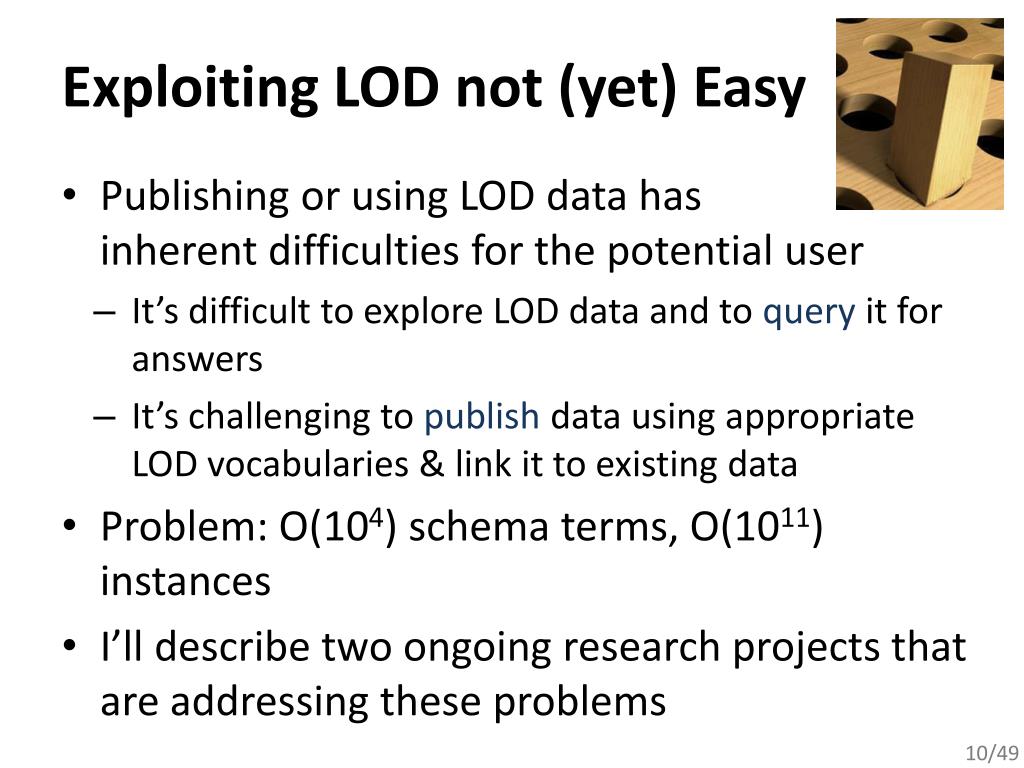 Exploiting LOD not (yet) Easy • Publishing or using LOD data hasinherent difficulties for the potential user • It’s difficult to explore LOD data and to query it for answers • It’s challenging to publish data using appropriate LOD vocabularies & link it to existing data • Problem: O(104) schema terms, O(1011) instances • I’ll describe two ongoing research projects that are addressing these problems