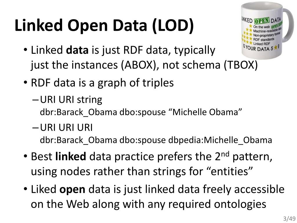 Linked Open Data (LOD) • Linked data is just RDF data, typicallyjust the instances (ABOX), not schema (TBOX) • RDF data is a graph of triples • URI URI stringdbr:Barack_Obamadbo:spouse “Michelle Obama” • URI URI URIdbr:Barack_Obamadbo:spousedbpedia:Michelle_Obama • Best linked data practice prefers the 2nd pattern, using nodes rather than strings for “entities” • Liked open data is just linked data freely accessible on the Web along with any required ontologies