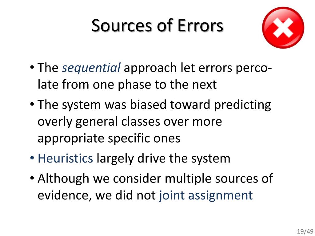 Sources of Errors The sequential approach let errors perco-late from one phase to the next The system was biased toward predicting overly general classes over more appropriate specific ones Heuristics largely drive the system Although we consider multiple sources of evidence, we did not joint assignment