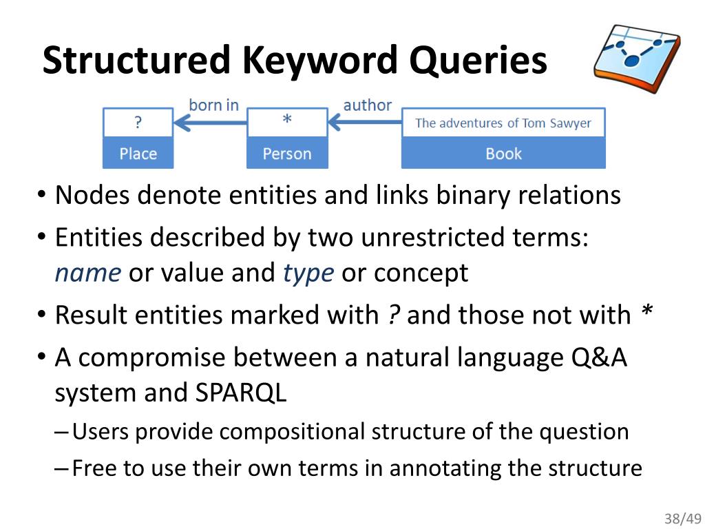 Structured Keyword Queries • Nodes denote entities and links binary relations • Entities described by two unrestricted terms: name or value and typeor concept • Result entities marked with ? and those not with * • A compromise between a natural language Q&A system and SPARQL • Users provide compositional structure of the question • Free to use their own terms in annotating the structure