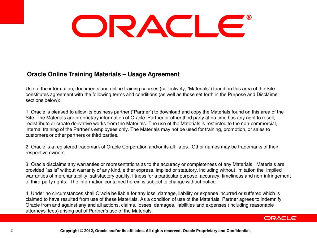 Oracle Online Training Materials – Usage Agreement Use of the information, documents and online training courses (collectively, “Materials”) found on this area of the Site constitutes agreement with the following terms and conditions (as well as those set forth in the Purpose and Disclaimer sections below): 1. Oracle is pleased to allow its business partner (“Partner”) to download and copy the Materials found on this area of the Site. The Materials are proprietary information of Oracle. Partner or other third party at no time has any right to resell, redistribute or create derivative works from the Materials. The use of the Materials is restricted to the non-commercial, internal training of the Partner’s employees only. The Materials may not be used for training, promotion, or sales to customers or other partners or third parties. 2. Oracle is a registered trademark of Oracle Corporation and/or its affiliates. Other names may be trademarks of their respective owners. 3. Oracle disclaims any warranties or representations as to the accuracy or completeness of any Materials. Materials are provided "as is" without warranty of any kind, either express, implied or statutory, including without limitation the implied warranties of merchantability, satisfactory quality, fitness for a particular purpose, accuracy, timeliness and non-infringement of third-party rights. The information contained herein is subject to change without notice. 4. Under no circumstances shall Oracle be liable for any loss, damage, liability or expense incurred or suffered which is claimed to have resulted from use of these Materials. As a condition of use of the Materials, Partner agrees to indemnify Oracle from and against any and all actions, claims, losses, damages, liabilities and expenses (including reasonable attorneys' fees) arising out of Partner’s use of the Materials. 2