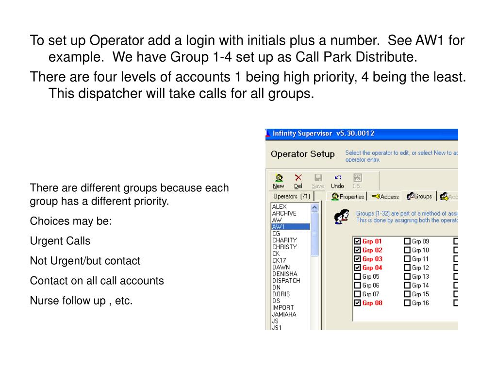 To set up Operator add a login with initials plus a number. See AW1 for example. We have Group 1-4 set up as Call Park Distribute. There are four levels of accounts 1 being high priority, 4 being the least. This dispatcher will take calls for all groups. There are different groups because each group has a different priority. Choices may be: Urgent Calls Not Urgent/but contact Contact on all call accounts Nurse follow up , etc.