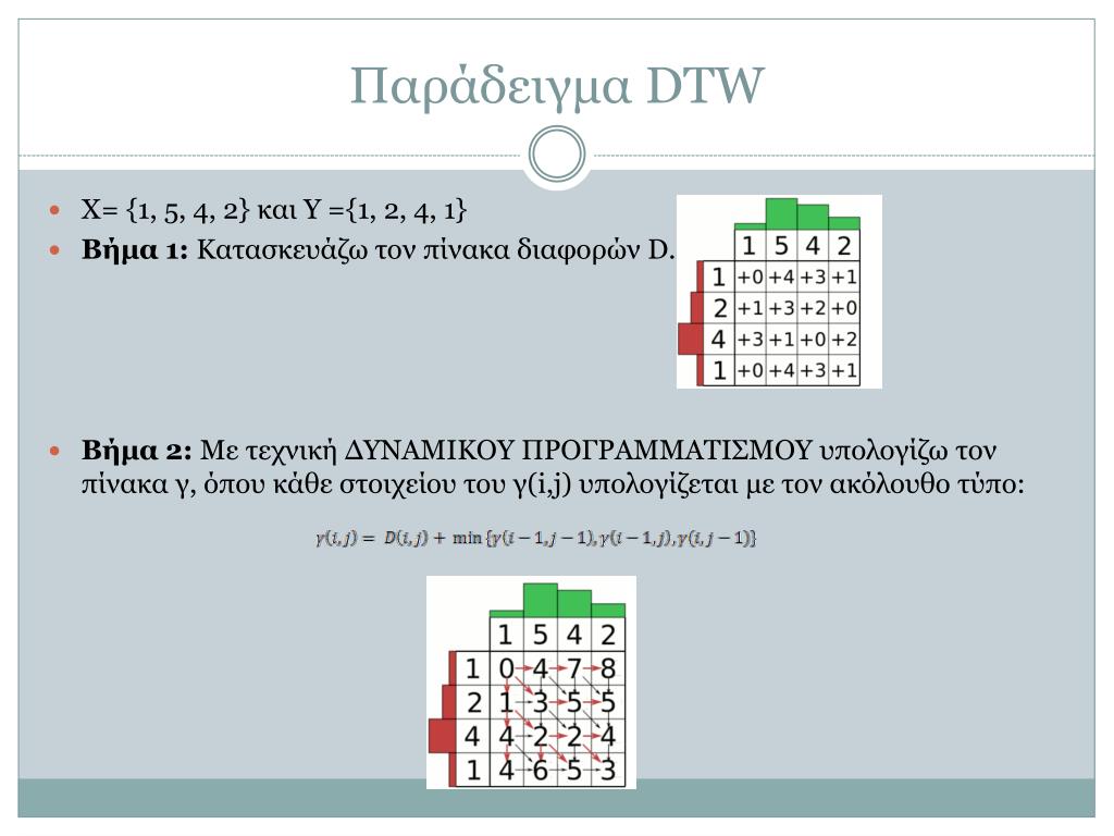 Παράδειγμα DTW X= {1, 5, 4, 2} και Υ ={1, 2, 4, 1} Βήμα 1: Κατασκευάζω τον πίνακα διαφορών D. Βήμα 2: Με τεχνική ΔΥΝΑΜΙΚΟΥ ΠΡΟΓΡΑΜΜΑΤΙΣΜΟΥ υπολογίζω τον πίνακα γ, όπου κάθε στοιχείου του γ(i,j) υπολογίζεται με τον ακόλουθο τύπο: