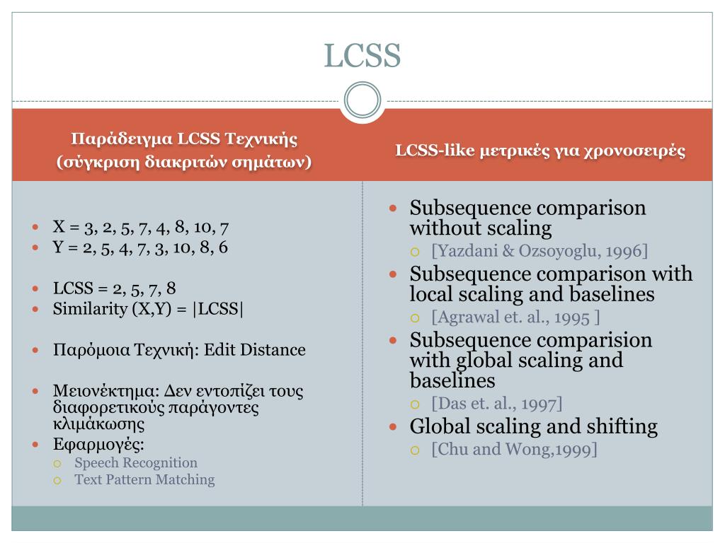 LCSS Παράδειγμα LCSS Τεχνικής (σύγκριση διακριτών σημάτων) LCSS-like μετρικές για χρονοσειρές • X = 3, 2, 5, 7, 4, 8, 10, 7 • Y = 2, 5, 4, 7, 3, 10, 8, 6 • LCSS = 2, 5, 7, 8 • Similarity (X,Y) = |LCSS| • Παρόμοια Τεχνική: Edit Distance • Μειονέκτημα: Δεν εντοπίζει τους διαφορετικούς παράγοντες κλιμάκωσης • Εφαρμογές: • Speech Recognition • Text Pattern Matching • Subsequence comparison without scaling • [Yazdani & Ozsoyoglu, 1996] • Subsequence comparison with local scalingand baselines • [Agrawal et. al., 1995 ] • Subsequence comparision with global scalingand baselines • [Das et. al., 1997] • Global scaling and shifting • [Chu and Wong,1999]