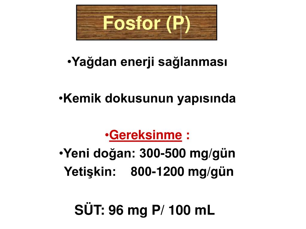 Fosfor (P) Yağdan enerji sağlanması Kemik dokusunun yapısında Gereksinme : Yeni doğan: 300-500 mg/gün Yetişkin: 800-1200 mg/gün SÜT: 96 mg P/ 100 mL