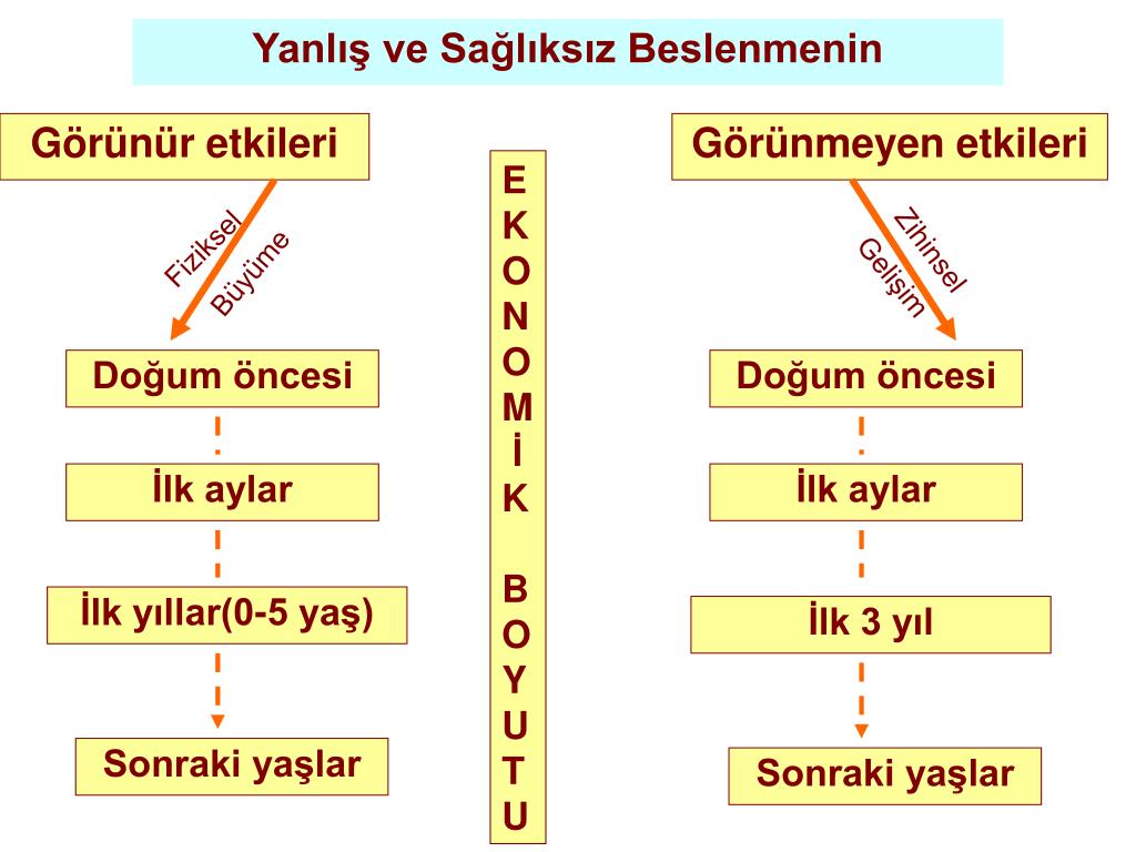 Yanlış ve Sağlıksız Beslenmenin Görünür etkileri Görünmeyen etkileri E K O N O M İ K B O Y U T U Fiziksel Zihinsel Büyüme Gelişim Doğum öncesi Doğum öncesi İlk aylar İlk aylar İlk yıllar(0-5 yaş) İlk 3 yıl Sonraki yaşlar Sonraki yaşlar