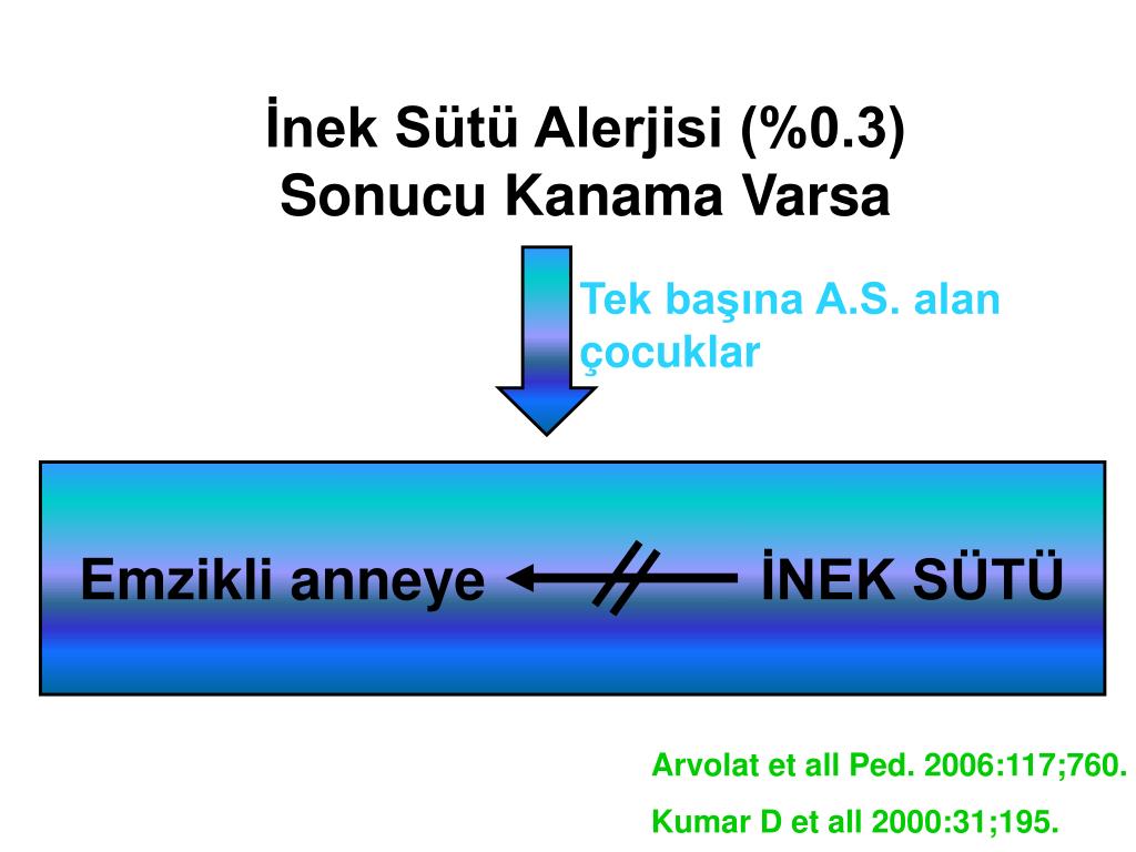 İnek Sütü Alerjisi (%0.3) Sonucu Kanama Varsa Tek başına A.S. alan çocuklar Emzikli anneye İNEK SÜTÜ Arvolat et all Ped. 2006:117;760. Kumar D et all 2000:31;195.
