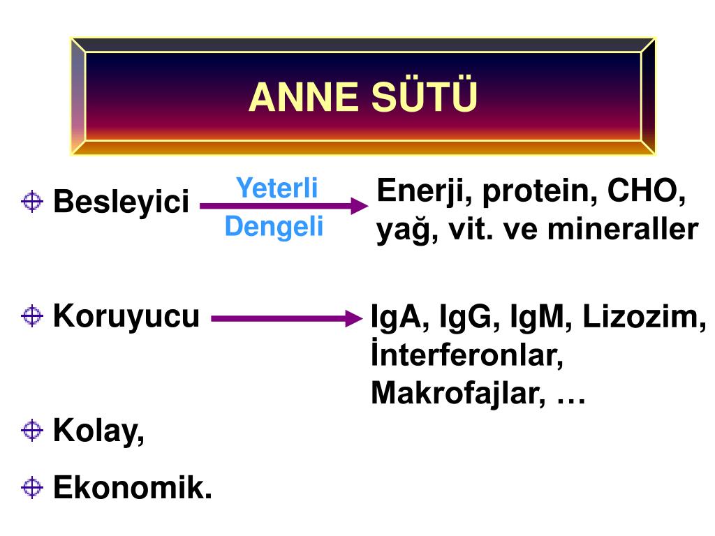 ANNE SÜTÜ Yeterli Enerji, protein, CHO, yağ, vit. ve mineraller • Besleyici • Koruyucu • Kolay, • Ekonomik. Dengeli IgA, IgG, IgM, Lizozim, İnterferonlar, Makrofajlar, …