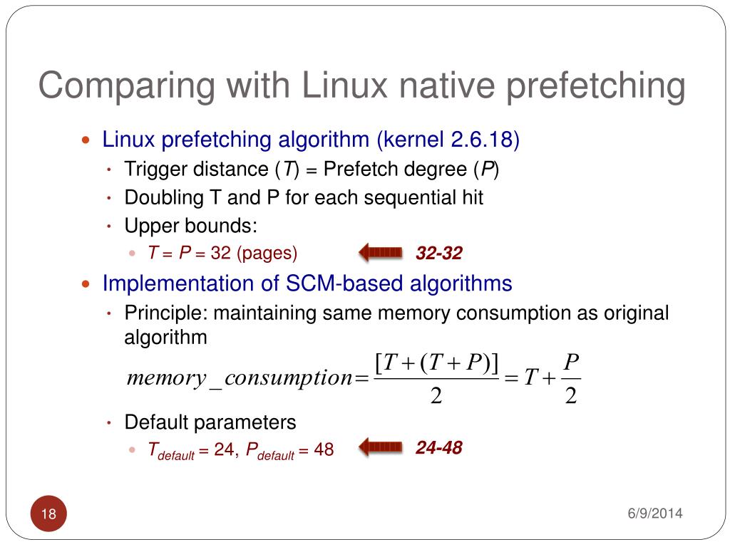 Comparing with Linux native prefetching • Linux prefetching algorithm (kernel 2.6.18) • Trigger distance (T) = Prefetch degree (P) • Doubling T and P for each sequential hit • Upper bounds: • T = P = 32 (pages) • Implementation of SCM-based algorithms • Principle: maintaining same memory consumption as original algorithm • Default parameters • Tdefault = 24, Pdefault = 48 32-32 24-48