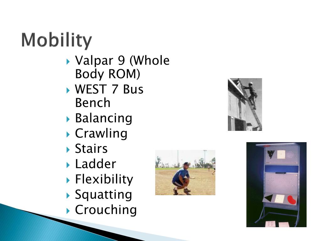 Mobility • Valpar 9 (Whole Body ROM) • WEST 7 Bus Bench • Balancing • Crawling • Stairs • Ladder • Flexibility • Squatting • Crouching