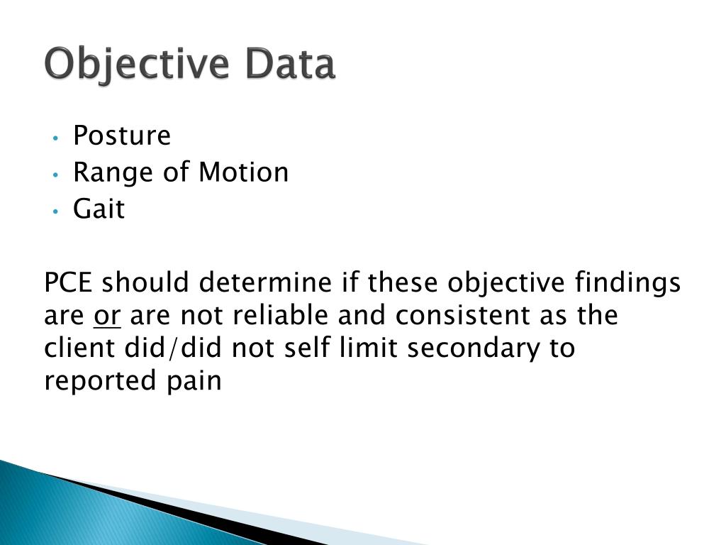 Objective Data • Posture • Range of Motion • Gait PCE should determine if these objective findings are or are not reliable and consistent as the client did/did not self limit secondary to reported pain