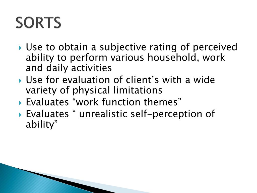 SORTS • Use to obtain a subjective rating of perceived ability to perform various household, work and daily activities • Use for evaluation of client’s with a wide variety of physical limitations • Evaluates “work function themes” • Evaluates “ unrealistic self-perception of ability”