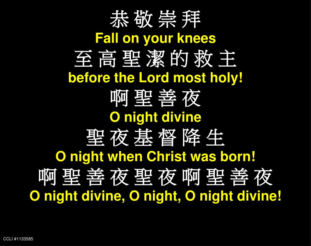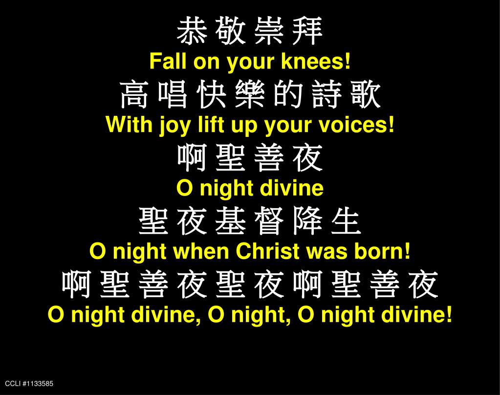 恭 敬 崇 拜 Fall on your knees! 高 唱 快 樂 的 詩 歌 With joy lift up your voices! 啊 聖 善 夜 O night divine 聖 夜 基 督 降 生 O night when Christ was born! 啊 聖 善 夜 聖 夜 啊 聖 善 夜 O night divine, O night, O night divine! CCLI #1133585