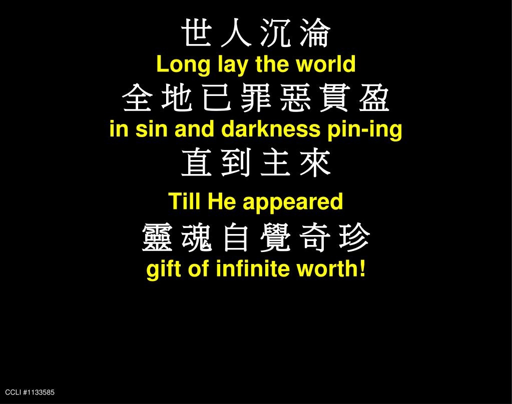 啊聖善夜 O Holy Night. Hymn 139 John S. Dwight, Adolphe Adam. CCLI #1133585. 啊 聖 善 夜 O holy night! 眾 星 照 耀 極 光 明 the stars are brightly shining 今 夜 良 辰 It is the night of the 親 愛 救 主 降 生 dear Savior’s birth! 1 A. CCLI #1133585. 世 人 沉 淪 Long lay the world 全 地 已 罪 惡 貫 盈