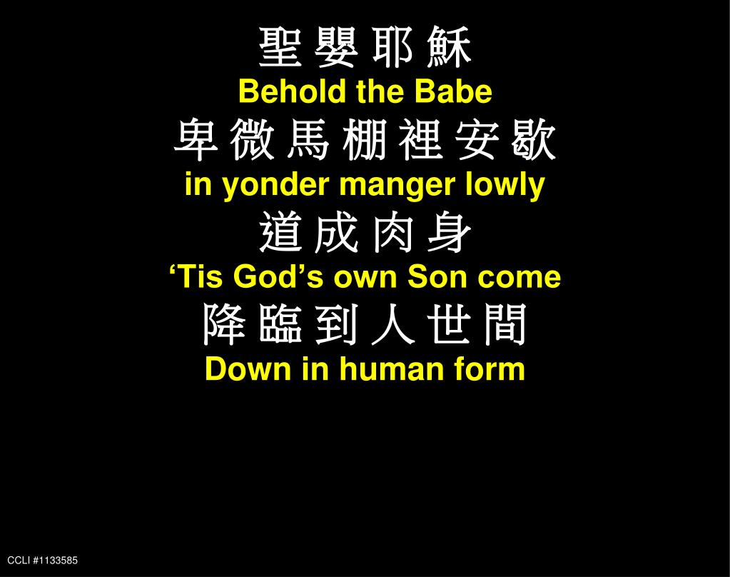 聖 嬰 耶 穌 Behold the Babe 卑 微 馬 棚 裡 安 歇 in yonder manger lowly 道 成 肉 身 ‘Tis God’s own Son come 降 臨 到 人 世 間 Down in human form 因你愛的大能 Power Of Love CCLI #1133585