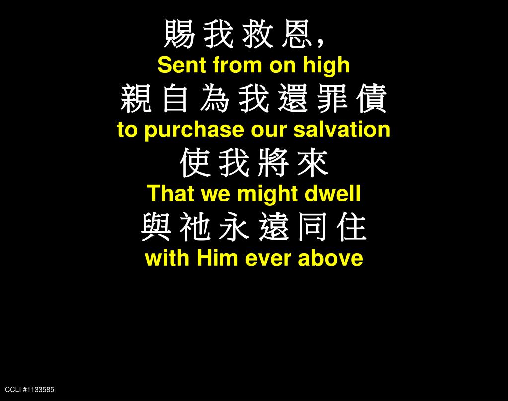 賜 我 救 恩﹐ Sent from on high 親 自 為 我 還 罪 債 to purchase our salvation 使 我 將 來 That we might dwell 與 祂 永 遠 同 住 with Him ever above 因你愛的大能 Power Of Love CCLI #1133585