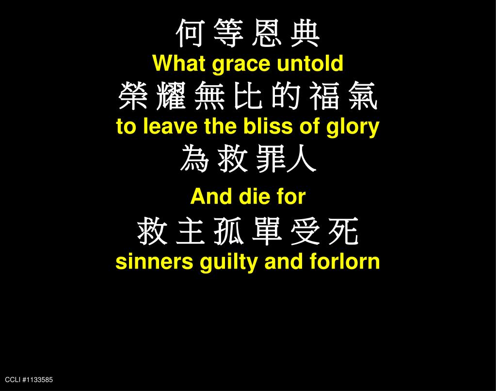 何 等 恩 典 What grace untold 榮 耀 無 比 的 福 氣 to leave the bliss of glory 為 救 罪人 And die for 救 主 孤 單 受 死 sinners guilty and forlorn CCLI #1133585