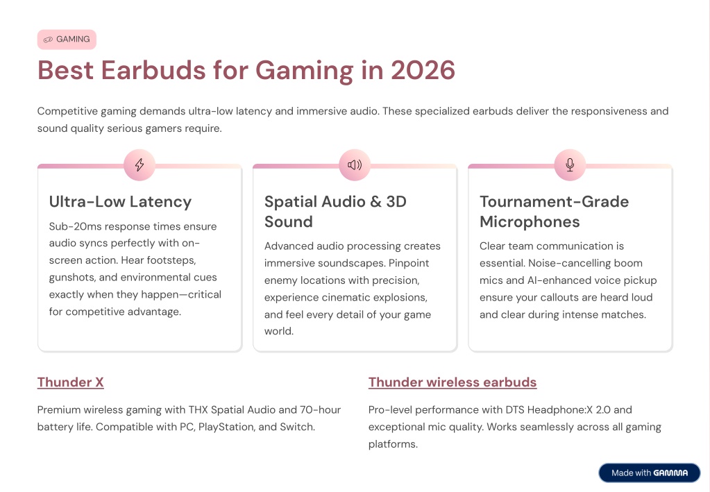 GAMING Best Earbuds for Gaming in 2026 Competitive gaming demands ultra-low latency and immersive audio. These specialized earbuds deliver the responsiveness and sound quality serious gamers require. Ultra-Low Latency Spatial Audio & 3D Sound Tournament-Grade Microphones Sub-20ms response times ensure audio syncs perfectly with on- screen action. Hear footsteps, gunshots, and environmental cues exactly when they happen—critical for competitive advantage. Advanced audio processing creates immersive soundscapes. Pinpoint enemy locations with precision, experience cinematic explosions, and feel every detail of your game world. Clear team communication is essential. Noise-cancelling boom mics and AI-enhanced voice pickup ensure your callouts are heard loud and clear during intense matches. Thunder X Thunder wireless earbuds Premium wireless gaming with THX Spatial Audio and 70-hour battery life. Compatible with PC, PlayStation, and Switch. Pro-level performance with DTS Headphone:X 2.0 and exceptional mic quality. Works seamlessly across all gaming platforms.