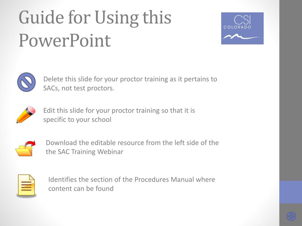 Guide for Using thisPowerPoint Delete this slide for your proctor training as it pertains to SACs, not test proctors. Edit this slide for your proctor training so that it is specific to your school Download the editable resource from the left side of the theSAC Training Webinar Identifies the section of the Procedures Manual where content can be found
