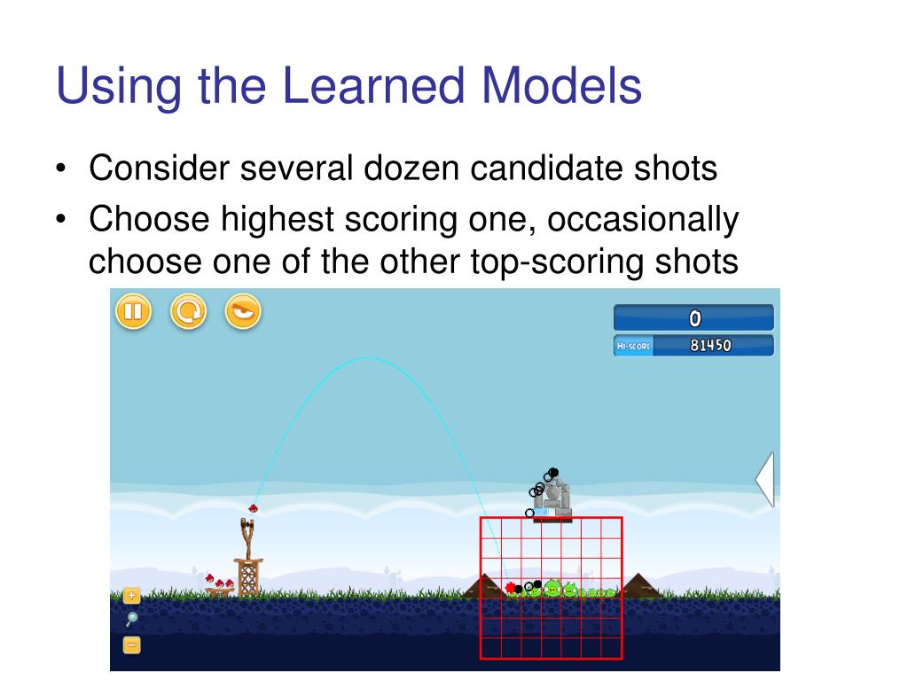 Using the Learned Models Consider several dozen candidate shots Choose highest scoring one, occasionally choose one of the other top-scoring shots