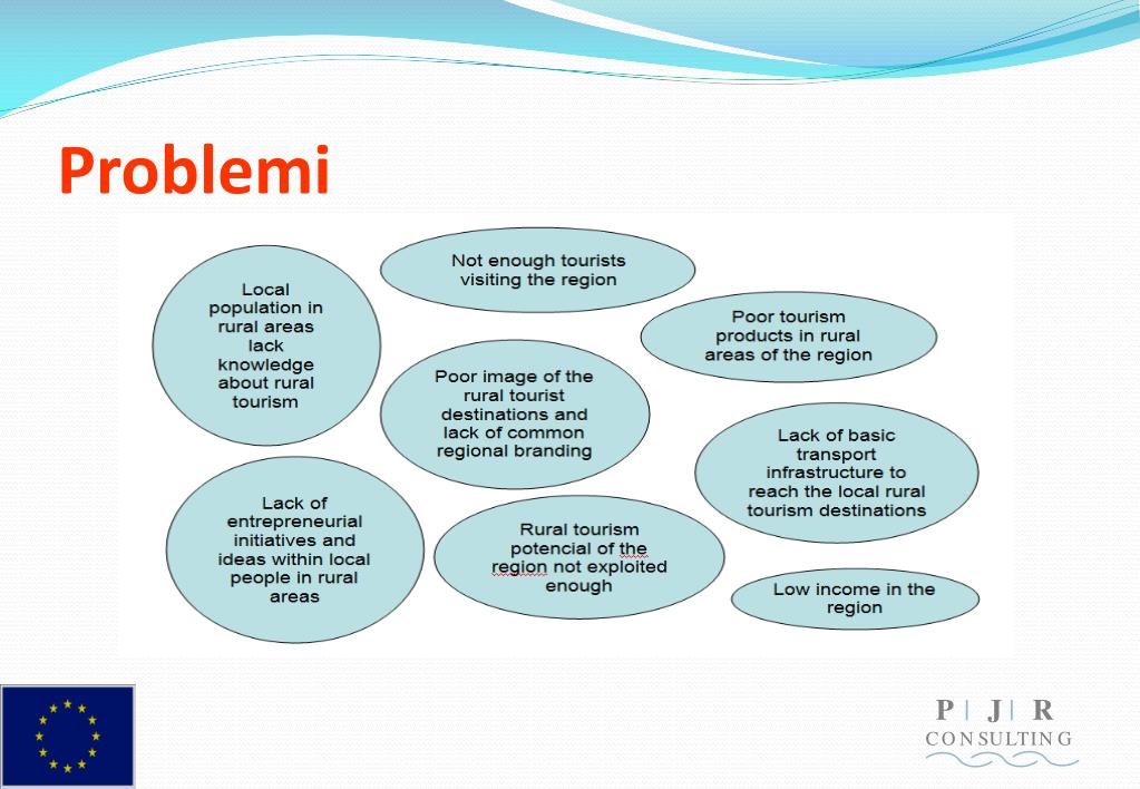 3. vježba: analiza problema • Prodiskutirajte listu problema (8 balona) koji se tiču ruralnog turizma • Identificirajte međusobnu povezanost između problema (uzrok – posljedica) • Moguće je imati 2-4 nivoa veza • Napravite povezanost (strelice) između problema