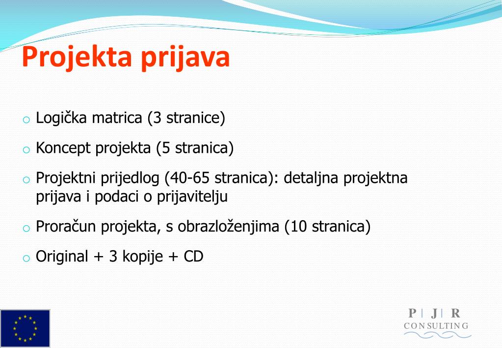 Projekta prijava • Logička matrica (3 stranice) • Koncept projekta (5 stranica) • Projektni prijedlog (40-65 stranica): detaljna projektna prijava i podaci o prijavitelju • Proračun projekta, s obrazloženjima (10 stranica) • Original + 3 kopije + CD