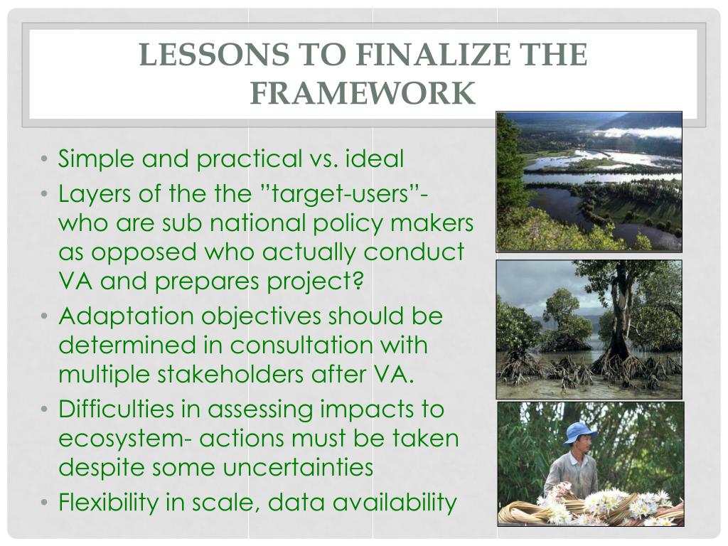 Lessons to finalize the framework • Simple and practical vs. ideal • Layers of the the ”target-users”- who are sub national policy makers as opposed who actually conduct VA and prepares project? • Adaptation objectives should be determined in consultation with multiple stakeholders after VA. • Difficulties in assessing impacts to ecosystem- actions must be taken despite some uncertainties • Flexibility in scale, data availability