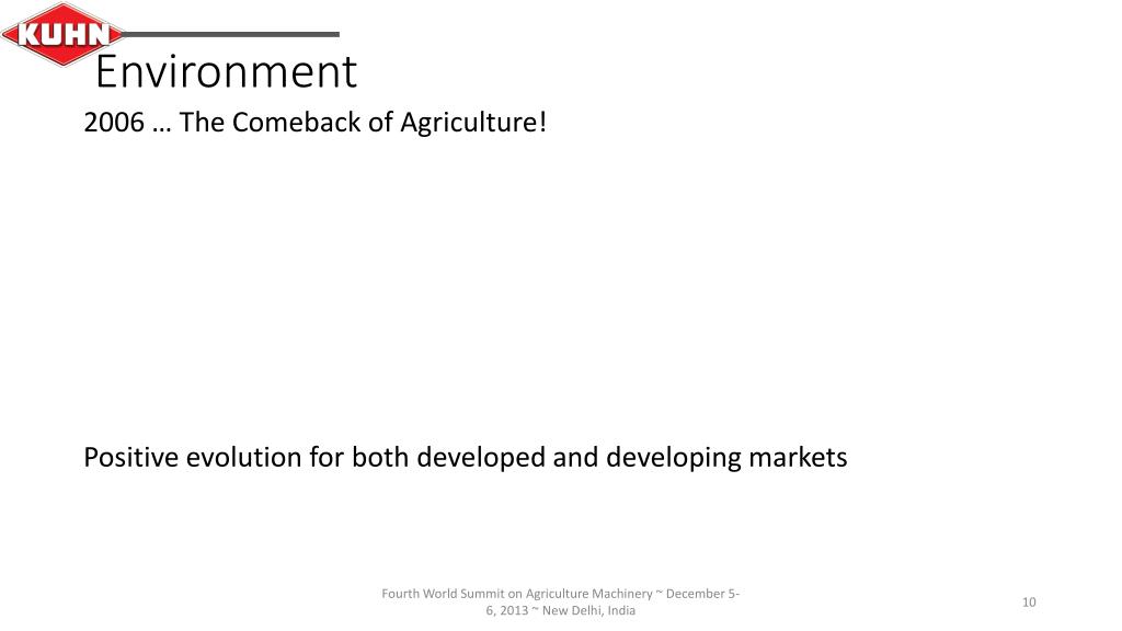 Environment 2006 … The Comeback of Agriculture! Positive evolution for bothdeveloped and developingmarkets Fourth World Summit on Agriculture Machinery ~ December 5-6, 2013 ~ New Delhi, India