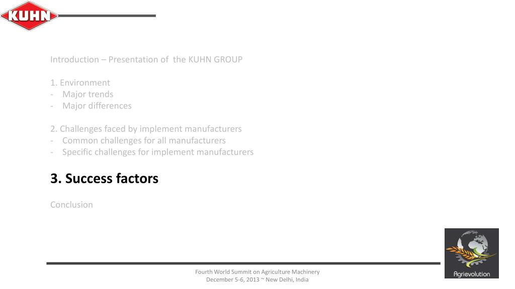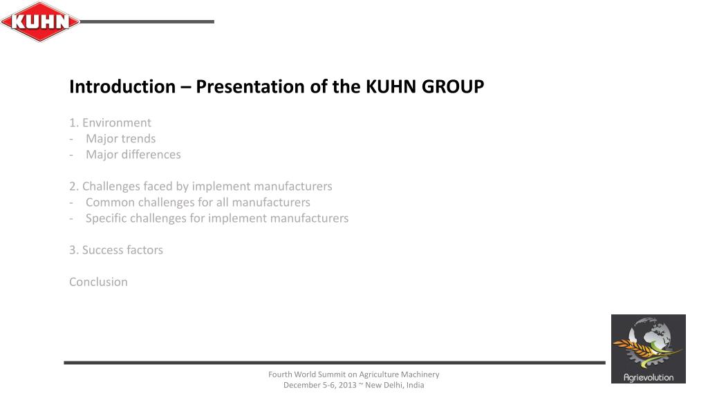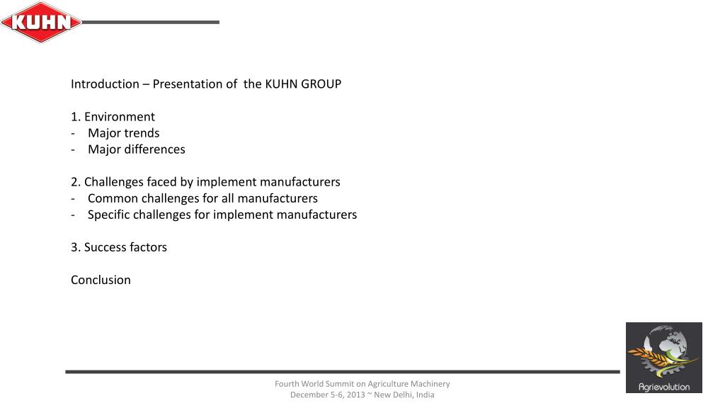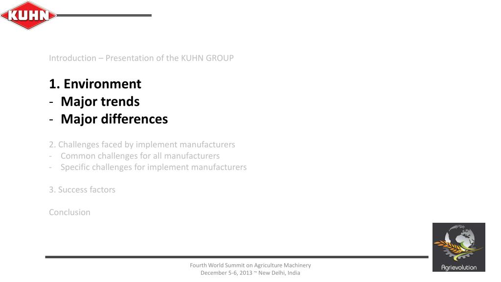Introduction – Presentation of the KUHN GROUP • 1. Environment • Major trends • Major differences • 2. Challenges faced by implementmanufacturers • Common challenges for all manufacturers • Specific challenges for implementmanufacturers • 3. Successfactors • Conclusion Fourth World Summit on Agriculture Machinery December 5-6, 2013 ~ New Delhi, India