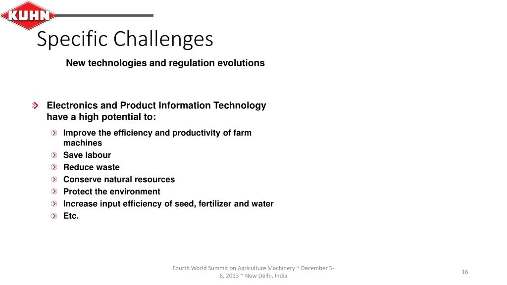 Specific Challenges New technologies and regulation evolutions • Electronics and Product Information Technology have a high potential to: • Improve the efficiency and productivity of farm machines • Save labour • Reduce waste • Conserve natural resources • Protect the environment • Increase input efficiency of seed, fertilizer andwater • Etc. Fourth World Summit on Agriculture Machinery ~ December 5-6, 2013 ~ New Delhi, India