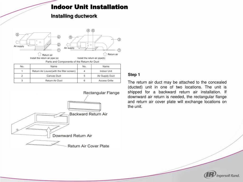 Indoor Unit Installation Installing ductwork Step 1 The return air duct may be attached to the concealed (ducted) unit in one of two locations. The unit is shipped for a backward return air installation. If downward air return is needed, the rectangular flange and return air cover plate will exchange locations on the unit.