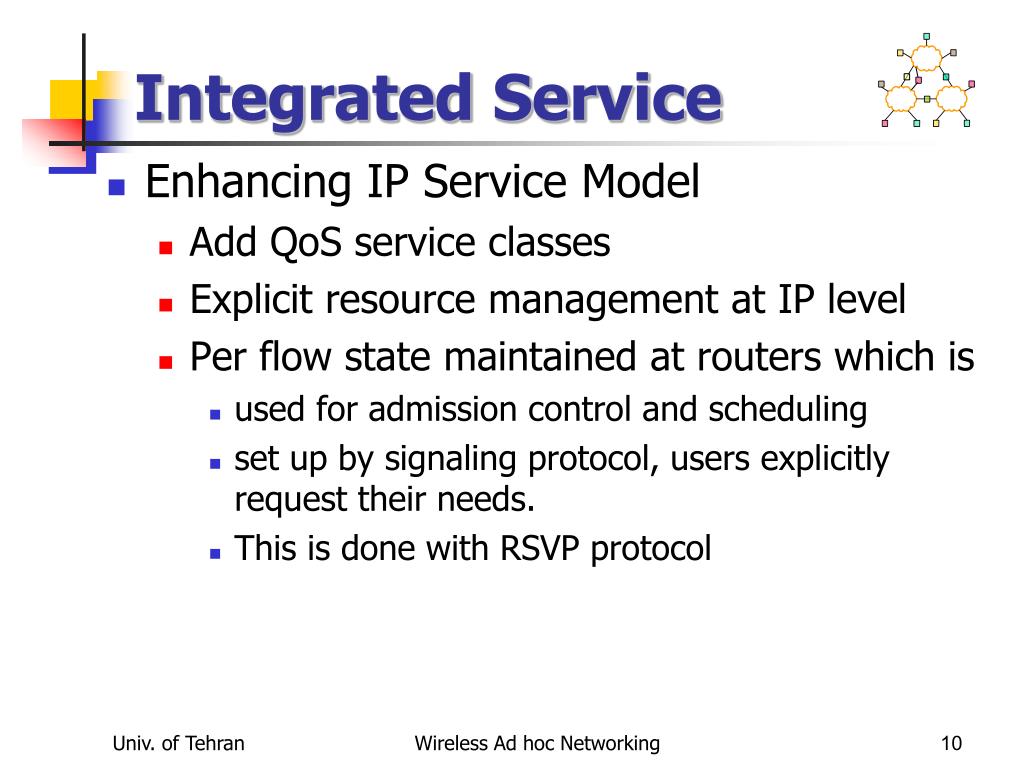 Outline • Quality of Service • QoS on IP networks: • Integrated Services • Differentiated Services • QoS on Wireless Link • QoS Routing • Cross layer Design Univ. of Tehran Wireless Ad hoc Networking 3