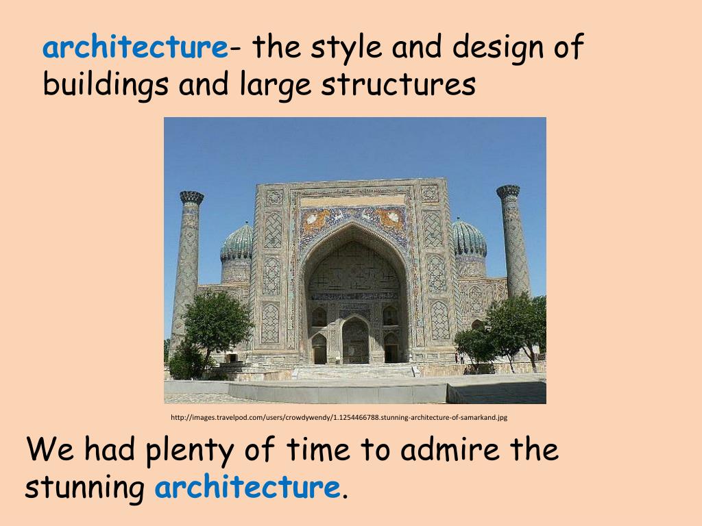 architecture- the style and design of buildings and large structures http://images.travelpod.com/users/crowdywendy/1.1254466788.stunning-architecture-of-samarkand.jpg We had plenty of time to admire the stunning architecture.