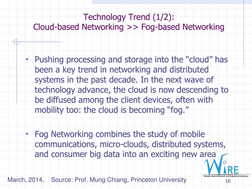 Technology Trend (1/2):Cloud-based Networking >> Fog-based Networking • Pushing processing and storage into the “cloud” has been a key trend in networking and distributed systems in the past decade. In the next wave of technology advance, the cloud is now descending to be diffused among the client devices, often with mobility too: the cloud is becoming “fog.” • Fog Networking combines the study of mobile communications, micro-clouds, distributed systems, and consumer big data into an exciting new area