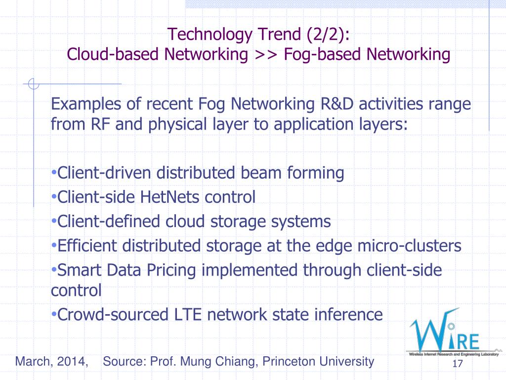 Technology Trend (2/2):Cloud-based Networking >> Fog-based Networking Examples of recent Fog Networking R&D activities range from RF and physical layer to application layers: • Client-driven distributed beam forming • Client-side HetNets control • Client-defined cloud storage systems • Efficient distributed storage at the edge micro-clusters • Smart Data Pricing implemented through client-side control • Crowd-sourced LTE network state inference