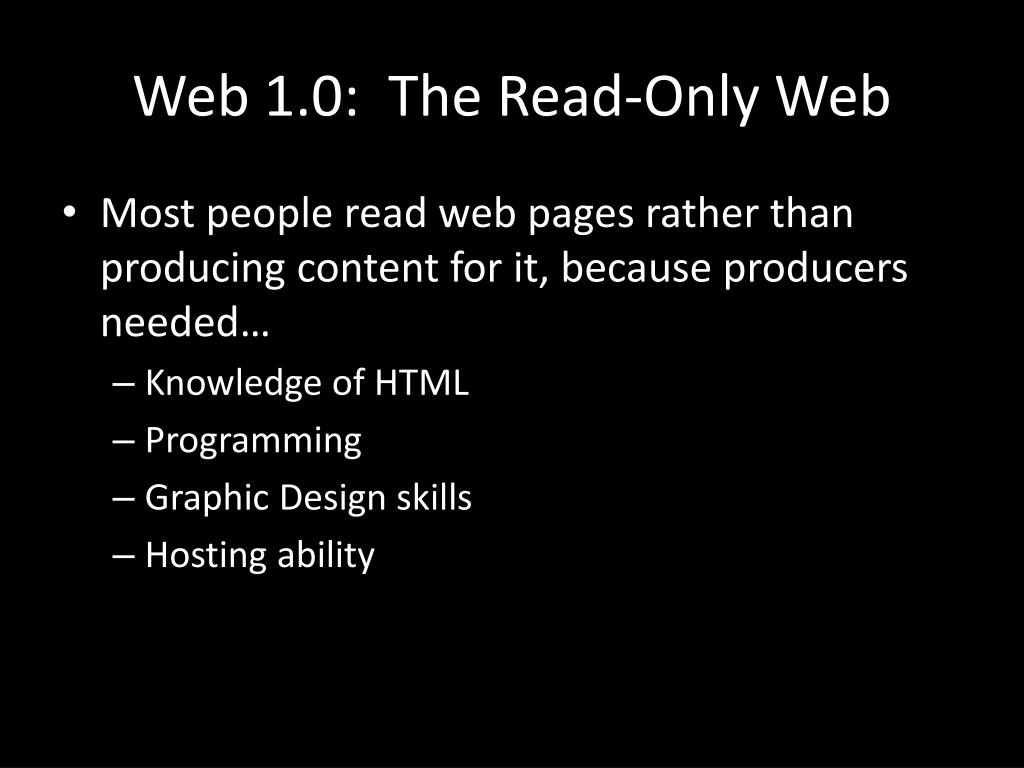 Web 1.0: The Read-Only Web • Most people read web pages rather than producing content for it, because producers needed… • Knowledge of HTML • Programming • Graphic Design skills • Hosting ability