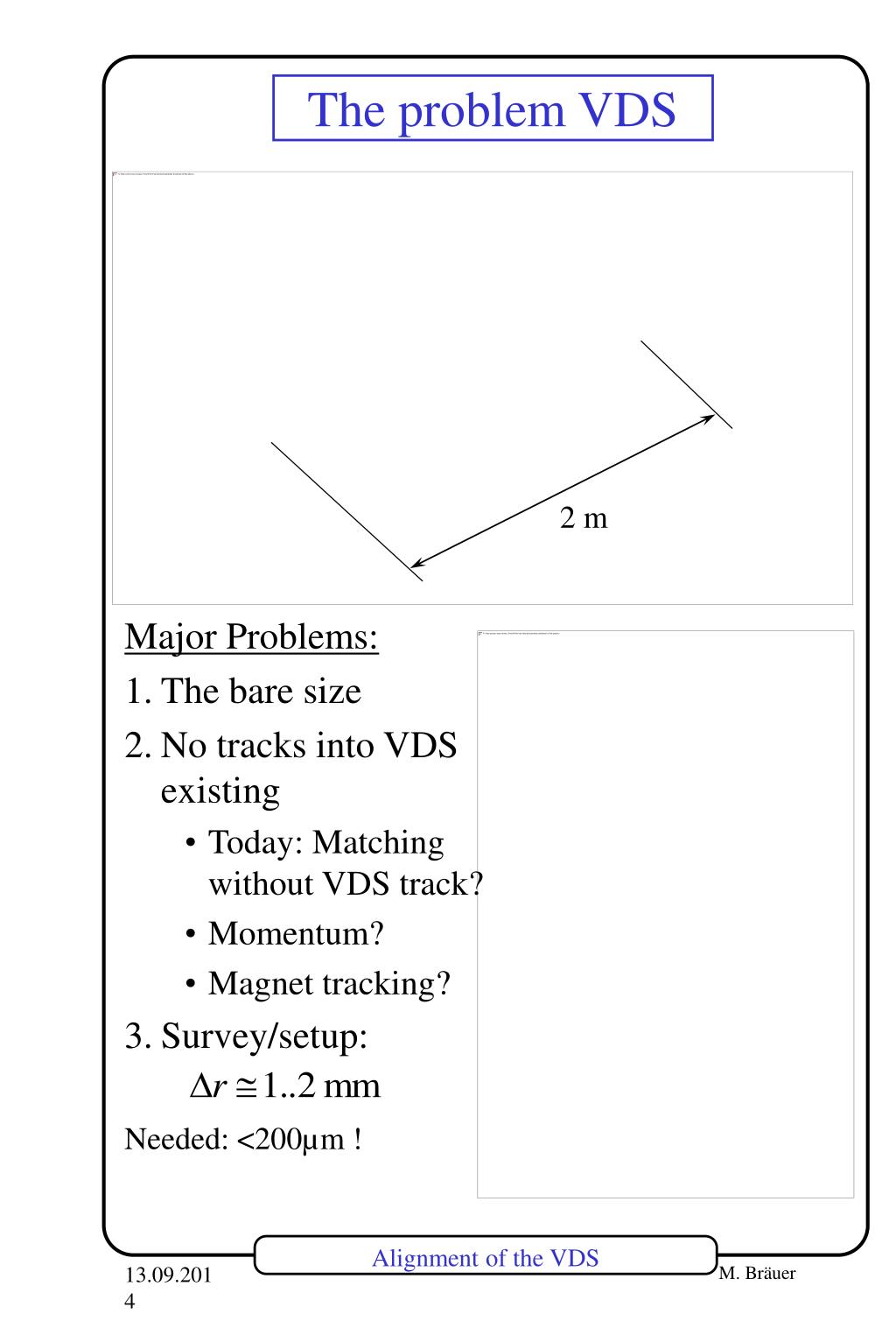 The problem VDS Major Problems: • The bare size • No tracks into VDS existing • Today: Matching without VDS track? • Momentum? • Magnet tracking? • Survey/setup: Needed: <200µm ! 2 m Alignment of the VDS